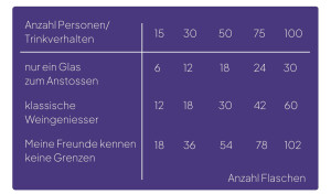 Wie viel Wein braucht es an einem Fest? Als Orientierungshilfe hier unsere Mengenstaffel: